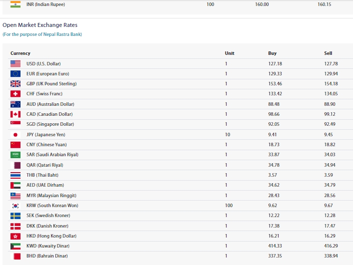 त्यस्तै, १ युरोपियन युुरो डलरको नेपाली बजारमा १२९ रुपैयाँ ३३ मा खरिद भईरहेको छ भने १२९ रुपैयाँ ९४ पैसामा विक्री भईरहेको छ । युके पाउन्डलाई १५३ रुपैयाँ ४६ पैसामा खरिद र १५४ रुपैयाँ १८ पैसामा बिक्रि भईरहेको छ ।