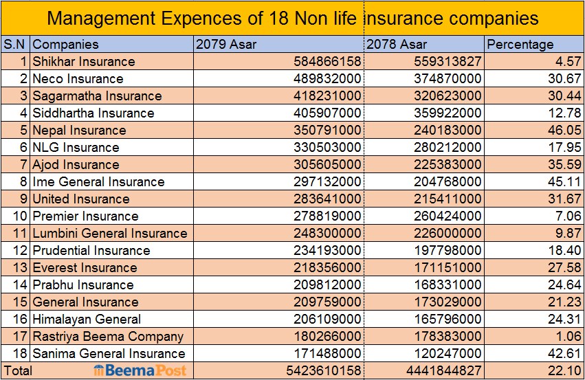 बीमा कम्पनीहरुले प्रकाशन गरेको वित्तीय विवरण अनुसार १८ निर्जीवन बीमा कम्पनीहरुले गत आवको असार मसान्तको तुलनामा व्यवस्थापन खर्च अघिल्लो आवको तुलनामा २२.१० प्रतिशतले बढी हो । अघिल्लो आर्थिक वर्षमा निर्जीवन बीमा कम्पनीहरको व्यवस्थापन खर्च ४ अर्ब ४४ करोडमाथि रहेको थियो ।