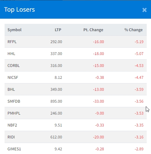 त्यस्तै, हिमालयन हाइड्रोपावरको ५.०७, कर्पोरेट डेभलपमेन्ट बैंकको ४.५३, एनआइसी एसियाको फण्डको ४.४७ र बलेफि हाइड्रोपावरको ३.५९ प्रतिशतले शेयर मूल्य घटेको छ ।
