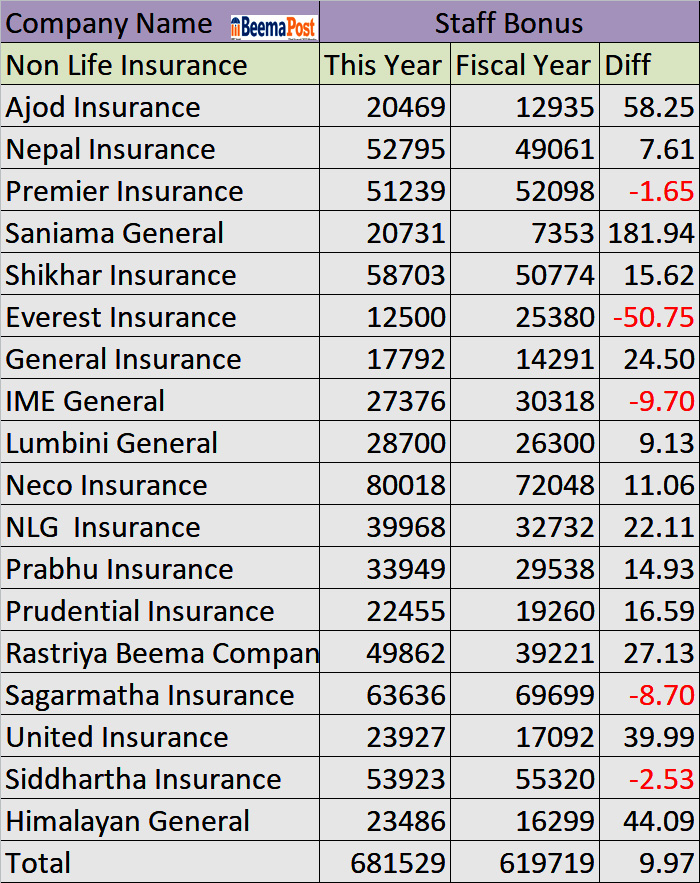 अघिल्लो आवको तुलनामा कर्मचारी बोनस व्यवस्थाका लागि छुटयाएको रकम अजोड इन्स्योरेन्सको ५८.२५ प्रतिशत, हिमालयन जनरलको ४४.०९ प्रतिशत, यूनाइटेड इन्स्योरेन्सको ३९.९९ प्रतिशत, राष्ट्रिय बीमा संस्थानको १७.१३ प्रतिशतले बढेको छ ।