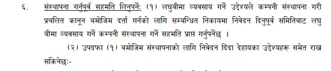 बीमा समितिको निर्देशिका नं ६ बुँदामा लघुबीमाको लाइसेन्सको लागि बीमा समितिबाट पूर्व स्वीकृत लिएर मात्रै कम्पनी रजिष्टारको कार्यालयमा दर्ता गर्नुपर्ने उल्लेख छ । बीमा समितिले जारी गरेको निर्देशनमा भनिएको छ, ‘सम्बन्धित निकायमा निवेदन दिनुपूर्व समितिबाट लघुबीमा व्यवसाय गर्ने कम्पनी संस्थापना गर्ने सहमति प्राप्त गर्नुपर्नेछ ।’ यस व्यवस्थाले दर्ता भई लघुबीमाको लाइसेन्स लिन तयारी अवस्थामा रहेका एक दर्जन कम्पनीहरुले लघुबीमाको लाइसेन्स नपाउने भएका हुन ।
