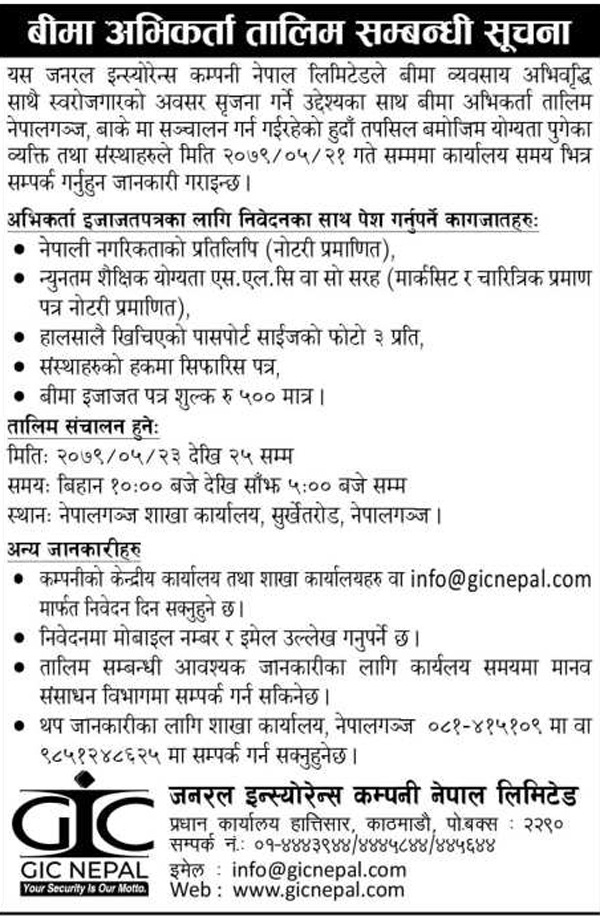 जनरल इन्स्योरेन्सले भदौ २३ गतेदेखि बीमा अभिकर्ताको तालिम दिने