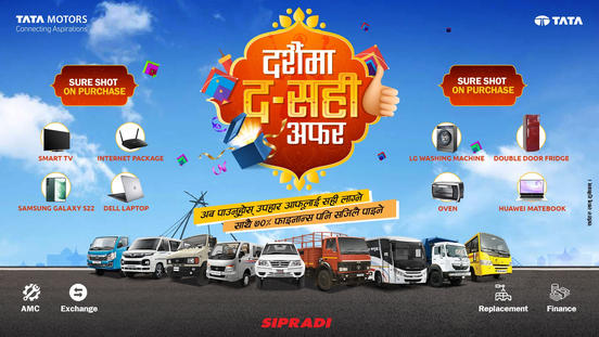 टाटा मोटर्सको नेपालका लागि आधिकारिक विक्रेता सिप्रदी ट्रेडिङ्ग प्रा. लि. ले यस २०७९ सालको दशैंलाई थप उत्साहजनक बनाउन “दशैँमा द–सही अफर”ल्याएको छ ।यस योजना अन्तर्गत ग्राहकहरुले टाटा मोटर्सका कुनै पनि कमर्सियल गाडी (ट्रक, बस, टिपर, मिनी ट्रक, मिनी टिपर, एस, योद्धा, विङ्गर, म्याजिक वा इन्ट्रा) खरिद गर्दा टिभी, फ्रिज, वासिङ्ग मेसिन, ओभन, ल्यापटप वा मोबाइल मध्ये कुनै एक उपहार प्राप्त गर्न सक्नेछन् ।