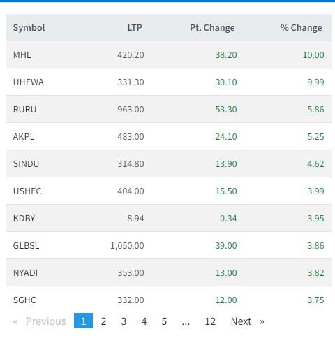 त्यस्तै, रुरु जलविधुत्, अरुण काबेली, सिन्धु विकास बैंक, अपर सोलु, कुमारी धनवृद्धि योजना, हिमालयन बैंक, गुराँस लघुवित्त, न्यादी हाईड्रोपावर र स्वेत गंगा शेयरमा सुधार देखिएको छ।