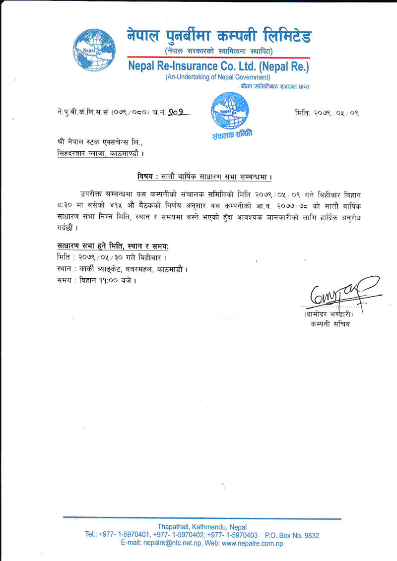 लाभांश प्रस्तावसहित नेपाल पुनर्बीमा कम्पनीले डाक्यो साधारण सभा, बुकक्लोज कहिले ?