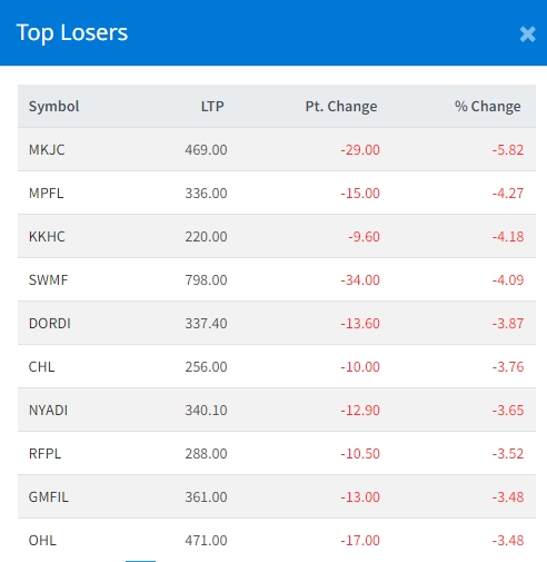 त्यस्तै, मल्टिप्रोपोज फाइनान्स कम्पनीको ४।२७, खानीखोला हाइड्रोपावरको ४।१८, सुुर्योदय वोमी लघुवित्तको ४।९ र दोर्दीखोला जलबिद्युतको ३।८७ प्रतिशतले शेयर मूल्य घटेको छ ।