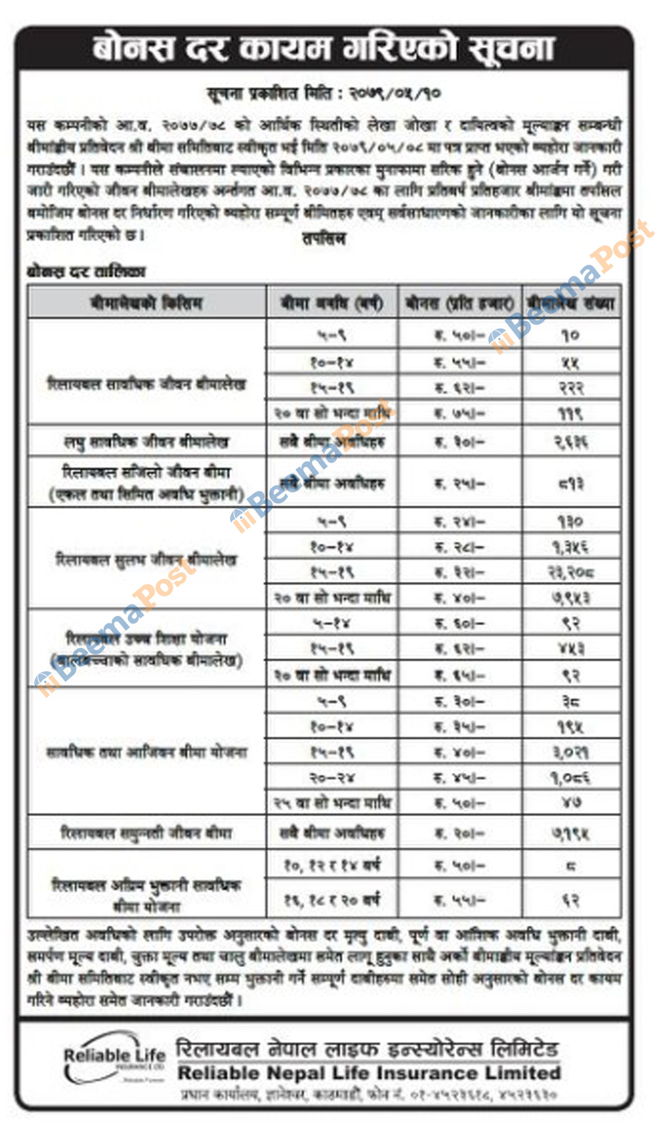 रिलायबल समुन्नती जीवन बीमा पोलिसीले सबै वर्षहरुमा २० रुपैयाँ प्रति वर्ष प्रति हजार बोनसदर तोकिएको छ ।त्यस्तै, रिलायबल अग्रिम भुक्तानी सावाधिक बीमा योजना अन्तर्गत १०, १२ र १४ वर्षसम्म अवधिका पोलिसीका लागि समान ५० रुपैयाँ, १६,१८ र २० वर्ष अवधिका पोलिसीका लागि समान ५५ रुपैयाँ बोनसदर कायम भएको छ ।