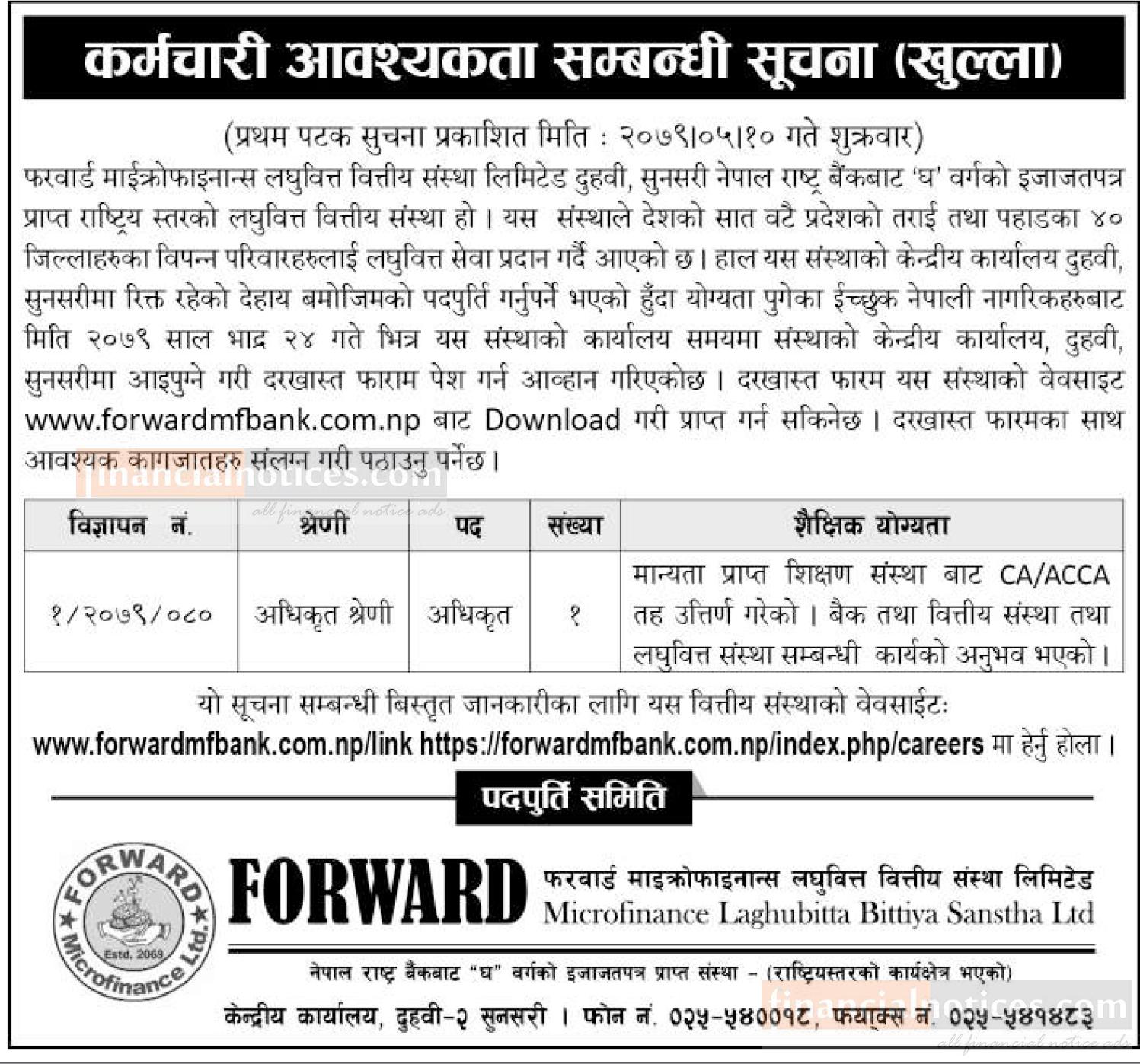 इच्छुक उम्मेदवारले लघुवित्तको वेवसाईट www.forwardmfbank.com.np मार्फत आवेदन दिन सक्नेछन् ।