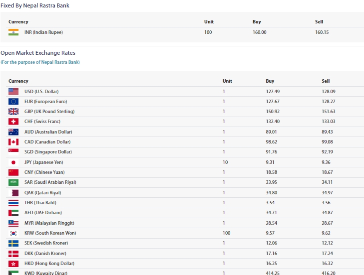 त्यस्तै, १ युरोपियन युुरो डलरको नेपाली बजारमा १२७ रुपैयाँ ६७ मा खरिद भईरहेको छ भने १२७ रुपैयाँ २७ पैसामा विक्री भईरहेको छ । युके पाउन्डलाई १४० रुपैयाँ ९२ पैसामा खरिद र १५१ रुपैयाँ ६३ पैसामा बिक्रि भईरहेको छ ।