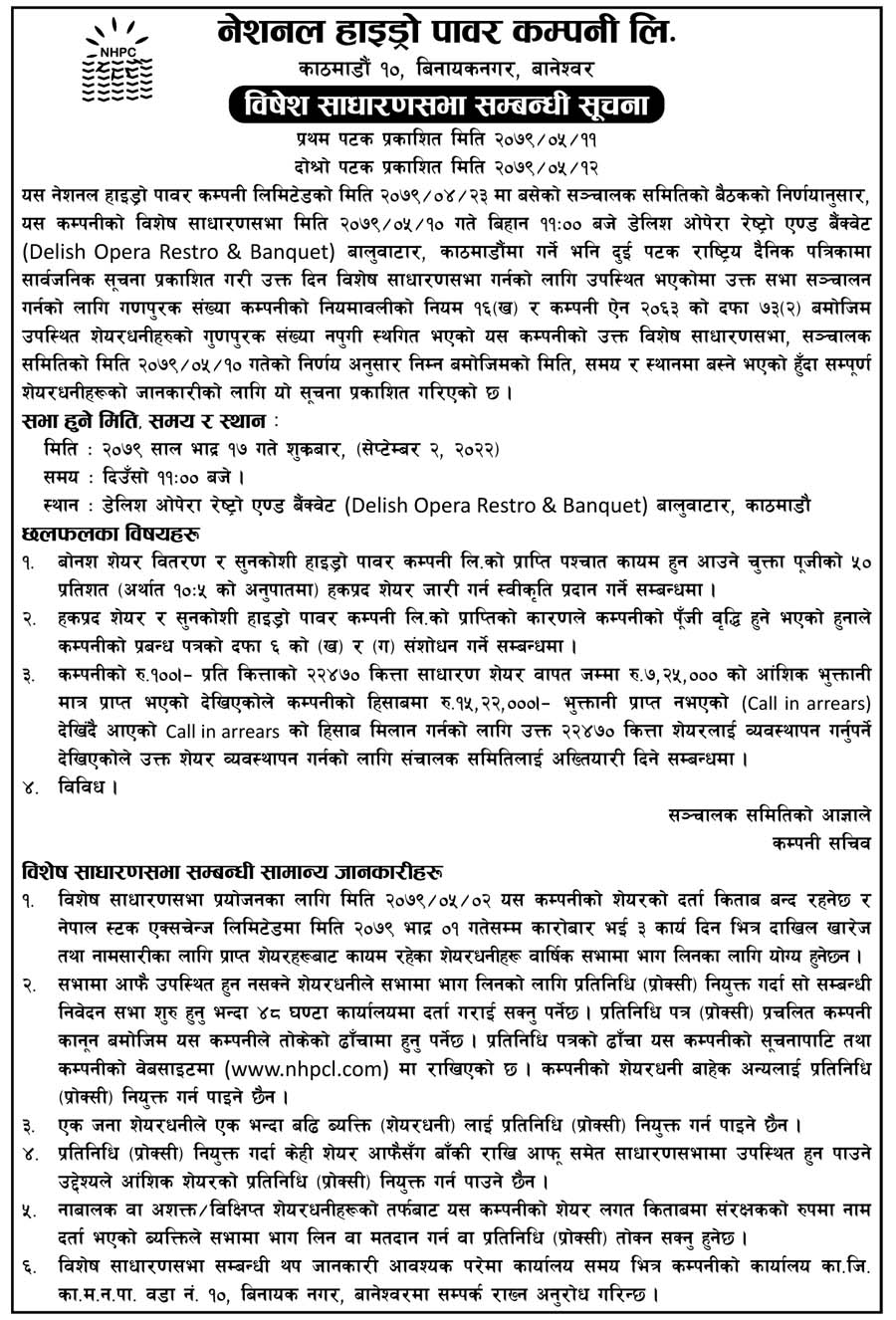उक्त सभाले बोनस शेयर वितरण र सुनकोशी हाइड्रोपावर कम्पनी प्राप्तिपश्चता कायम हुन आउने चुक्तापुँजीको ५० प्रतिशत अर्थात (१ः५) को अनुपातमा हकप्रद शेयर जारी गर्ने प्रस्ताव पारित गर्नेछ ।