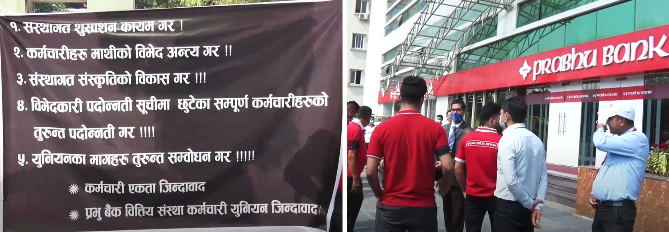 यही भदौं ७ गते प्रभु बैंकको केन्द्रीय कार्यालयमा बैंकमा कार्यरत कर्मचारीहरुले आन्दोलन गरेका हुन् । प्रभु बैंक वित्तीय संस्था कर्मचारी युनियनको नेतृत्वमा भएको आन्दोलनमा बैंकमा कार्यरत सयौं कर्मचारीहरु सहभागी बनेका छन् । आन्दोलनकारी कर्मचारीहरुले बैंकभित्र व्यक्तिगत सम्बन्ध, पावर र पहुँचका आधारमा गरिएको बढुवा खारेज गर्नुपर्ने लगायतका पाँच बुँदे माग अघि सारेका छन् ।