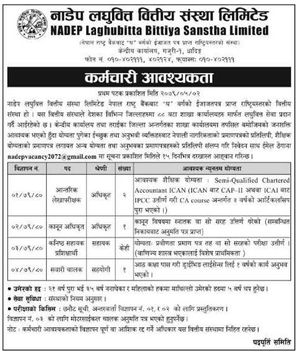काठमाडौं । नाडेप लघुवित्त वित्तीय संस्था लिमिटेडले रोजगारको अवसर खुलाएको छ । लघुवित्तले एक सूचना प्रकाशित गर्दै विभिन्न पदमा कर्मचारी आवश्यक रहेको जनाएको हो ।