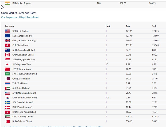 त्यस्तै, १ युरोपियन युुरो डलरको नेपाली बजारमा १२७ रुपैयाँ ४९ मा खरिद भईरहेको छ भने १२८ रुपैयाँ ०९ पैसामा विक्री भईरहेको छ । युके पाउन्डलाई १४९ रुपैयाँ ३३ पैसामा खरिद र १५० रुपैयाँ ३ पैसामा बिक्रि भईरहेको छ ।