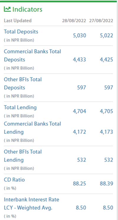 साउन ११ गतेसम्म ५० खर्ब २२ अर्ब रुपैयाँ रहेको बैंकहरुको निक्षेप साउन १२ गते आइतबारसम्म ८ अर्ब थपिएर ५० खर्ब ३० अर्ब निक्षेप पुगेको हो । जसमा वाणिज्य बैंकहरुको निक्षेप मात्रै ४४ खर्ब ३३ अर्ब रुपैयाँ रहेको छ । अघिल्लो दिन वाणिज्य बैंकहरुको निक्षेप ४४ खर्ब २५ अर्ब मात्रै रहेको थियो ।