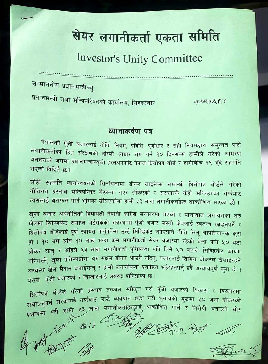 शेयर लगानीकर्ताहरुको संगठन लगानीकर्ता एकता समितिले सोही विषयलाई लिएर पुँजीबजार सुधारको माग गर्दै ध्यानाकर्षण पत्र बुझाएका हुन् ।
