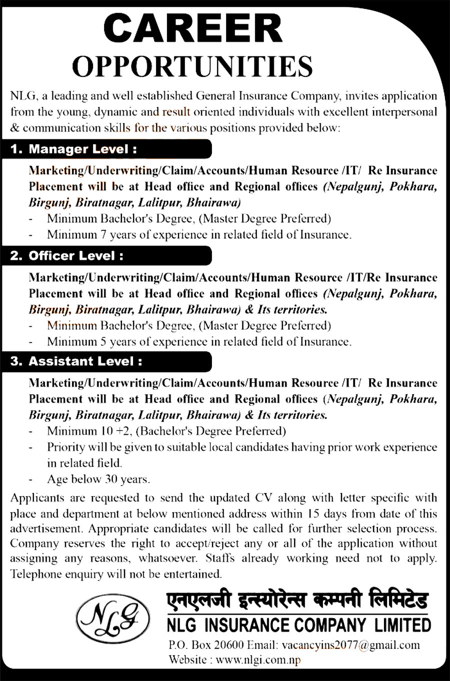 एनएलजी इन्स्योरेन्सले खुलायो रोजगारको अवसर, कति चाहिन्छ शैक्षिक योग्यता ?