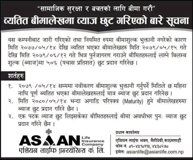 एशियन लाइफ इन्स्योरेन्सले व्यतित बीमालेखमा ५० प्रतिशत ब्याज छुट दिने