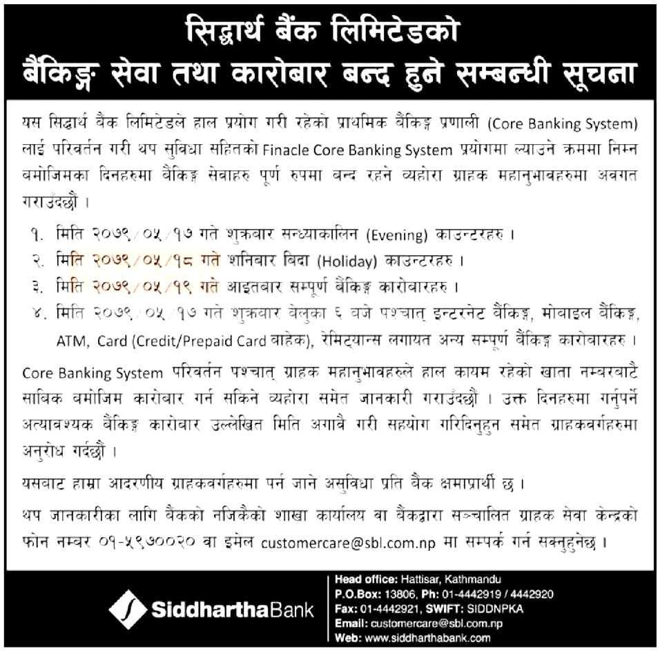 बैंकका अनुसार भदौ १७ गते शुक्रबार सन्ध्याकालिन काउन्टरहरु, भदौ १८ गते शनिबार बिदा काउन्टरहरु, भदौ १९ गते आइतबार सम्पूर्ण बैकिङ्ग कारोबारहरु र भदौ १७ गते शुक्रबार बेलुका ६ बजेपश्चात इन्टरनेट बैकिङ्ग, मोबाइल बैकिङ्ग सेवाहरु, एटिएम कार्ड, रेमिट्यान्टस लगायतका सम्पूर्ण बैकिङ्ग सेवाहरु बन्द रहनेछन् ।