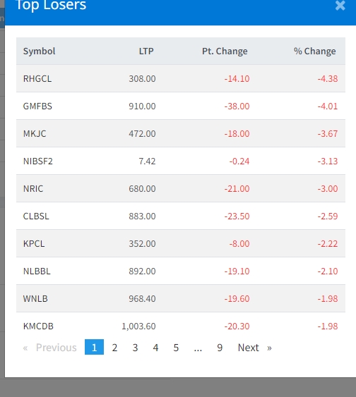 आज शेयर बजार घटेसँगै राप्ति हाइड्रो एण्ड जनरलको ४।३८, गनपति लघुवित्तको ४।१, मैलङ खोला जल विद्युतको ३।६७, एनआइबिएल समृद्धि फण्डको ३।१३ र नेपाल रिइन्स्योरेन्स कम्पनीको ३ प्रतिशतले शेयर मूल्य घटेको छ ।