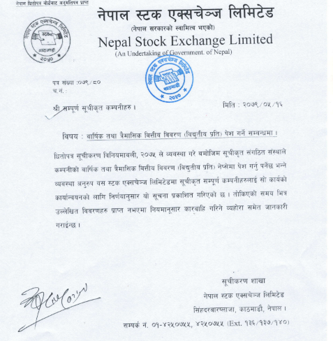 नेप्से सूचीकृत कम्पनीलाई वार्षिक तथा त्रैमासिक वित्तीय विवरणको विद्युतीय प्रति पेश गर्न निर्देशन दिएको हो । धितोपत्र सूचीकरण विनियमावली २०७५ अनुसार सूचीकृत संगठित संस्थाहरुले वार्षिक तथा त्रैमासिक वित्तीय विवरण विद्युतीय प्रति पेश गर्नुपर्ने व्यवस्था रहेको छ ।