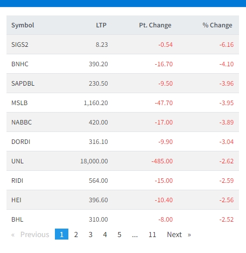 शेयर बजार ओरालो लागे सँगै सिद्धार्थ इन्भेष्टमेन्ट ग्रोथ स्किमको ६।१६, बुद्ध भुमि नेपाल हाइड्रोपावरको ४।१०,सप्तकोशि डेपलभमेन्ट बैंकको ३।९६, माहुली लघुवित्तको ३।९६ र नारायणी डेपलभमेन्ट बैंकको ३।८९ प्रतिशतले शेयर मूल्य घटेको छ ।