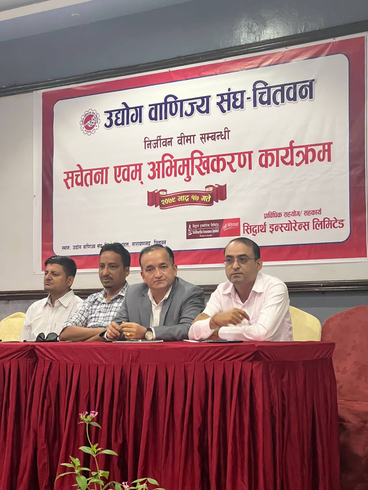 उक्त कार्यक्रमको अध्यक्षता उद्योग बाणिज्य संघ, चितवनका अध्यक्ष चुन नारायण श्रेष्ठले गर्नु भएको थियो भने सोहि कार्यक्रममा सिद्धार्थ इन्स्योरेन्सको तर्फबाट कम्पनीका सहायक महाप्रबन्धक नवराज पराजुली एवं प्रबन्धक माधव रेग्मीले निर्जिबन बीमाका विषयमा प्रस्तुतिकरण दिएका थिए ।