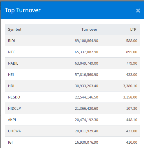 त्यस्तै, एनटिसीको ६ करोड ५३ लाख, नबिल बैंकको ६करोड ३० लाख, हिमालयन एभरेष्ट इन्स्योरेन्सको ५ करोड ७८ लाख र हिमालय डिस्टिलरीको ३ करोड ९ लाख रुपैयाँ भन्दा माथिको कारोबार भएको छ ।