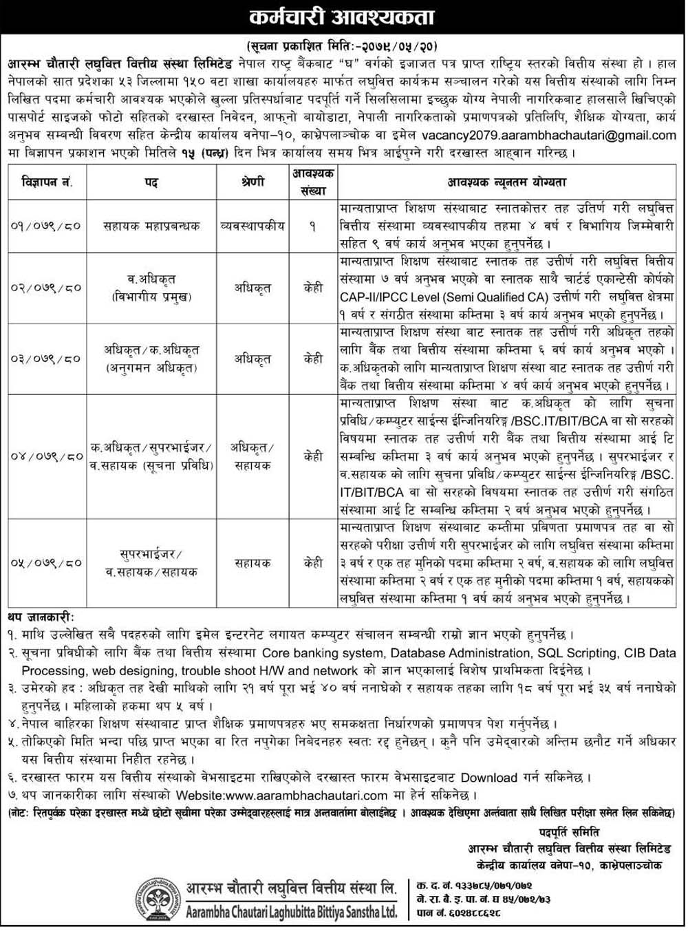 इच्छुक उम्मेदवारले सुचना प्रकाशित मितिले १५ दिन भित्र संस्थाको वेवसाइट https://www.aarambhachautari.com/ मार्फत आवेदन दिन सक्नेछन् ।