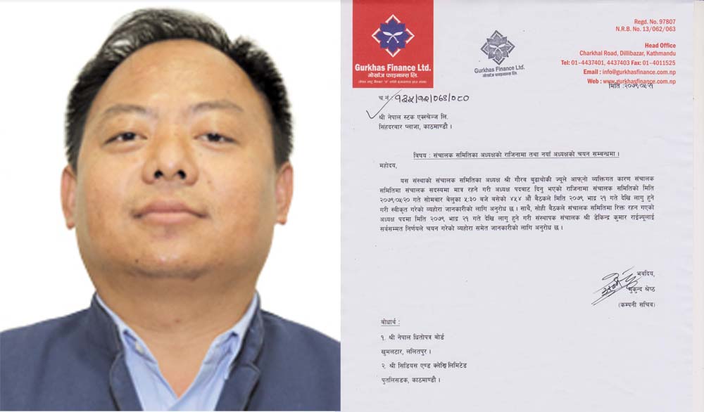 यसअघि सो पदमा रहेका गौरव बुढाथोकीले आफ्नो व्यक्तिगत कारण देखाई संचालक समितिको संचालक सदस्यमा मात्र रहने गरी अध्यक्ष पदबाट राजिनामा दिएकोमा भदौ २० गते बसेको बैठकले उनको राजिनामा भदौ २१ गतेदेखि लागू हुनेगरी स्वीकृत गरेको हो ।