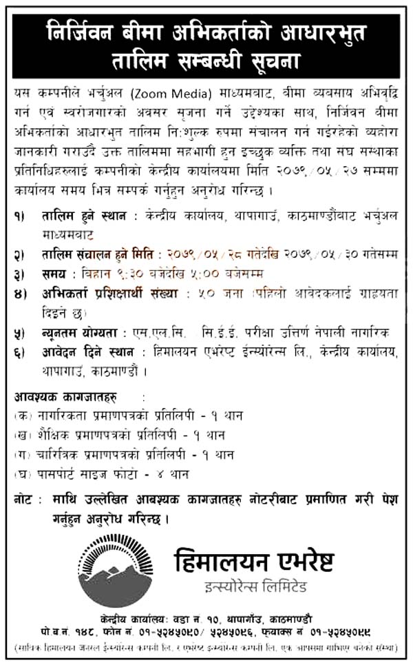 हिमालयन एभरेष्ट इन्स्योरेन्सले निःशुल्क निर्जिवन बीमा अभिकर्ताको तालिम दिने