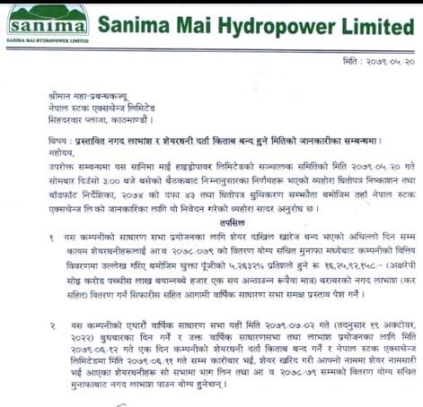 सानिमा माई हाइड्रोपावरद्धारा लाभांश प्रस्ताव, बुकक्लोजको मिति तय