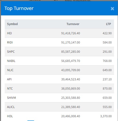 सो रकम बराबरको कारोबार हुँदा सर्वाधिक हिमालयन एभरेष्ट इन्स्योरेन्सको शेयर ९ करोड १४ लाख रुपैयाँमाथिको कारोबार भएको छ । त्यस्तै, रिडी हाइड्रोपावरको ९ करोड ११ लाख, सानिमा माई हाइड्रोपावरको ८ करोड ५५ लाख, नबिल बैंकको ५ करोड ६६ लाख र नेपाल लाइफ इन्स्योरेन्सको ४ करोड ३० लाख रुपैयाँमाथिको कारोबार भएको छ ।