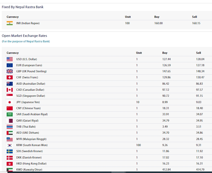 त्यस्तै, १ युरोपियन युुरो डलरको नेपाली बजारमा १२६ रुपैयाँ ५९ मा खरिद भईरहेको छ भने १२७ रुपैयाँ १८ पैसामा विक्री भईरहेको छ । युके पाउन्डलाई १४७ रुपैयाँ ६५ पैसामा खरिद र १४८ रुपैयाँ ३४ पैसामा बिक्रि भईरहेको छ ।