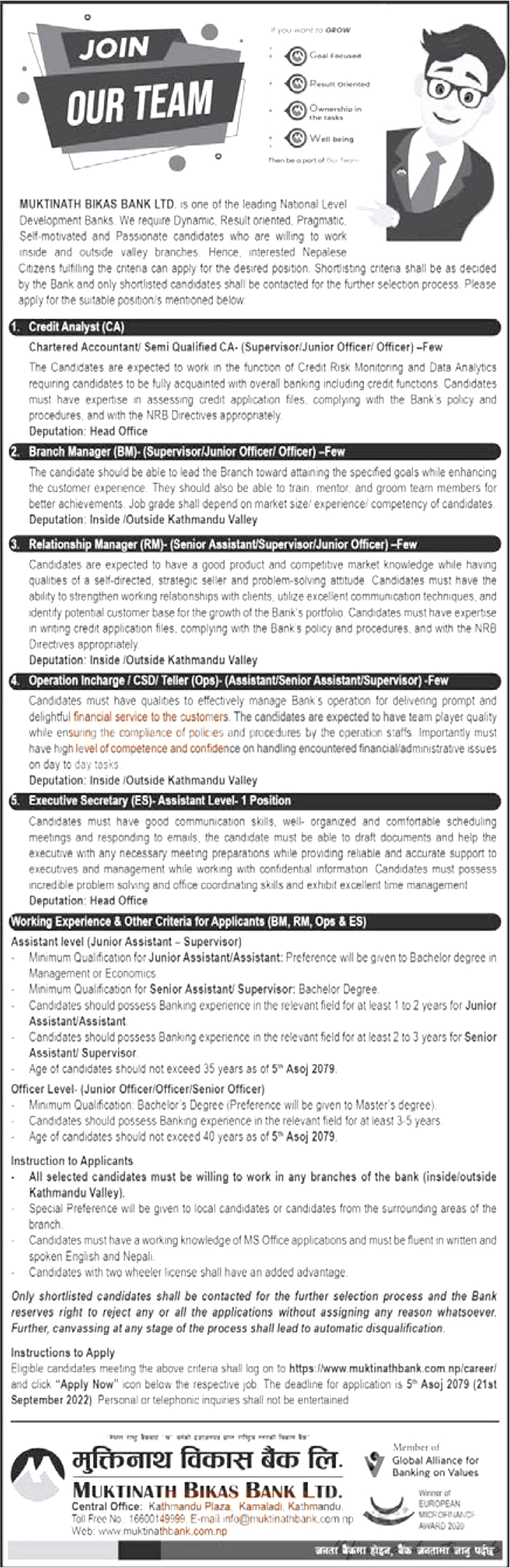 इच्छुक उम्मेदवारले असोज ५ गतेसम्म कम्पनीको वेवसाईट    https://www.muktinathbank.com.np/career/ मार्फत आवेदन दिन सक्नेछन् ।
