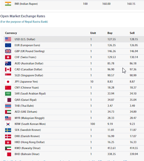 त्यस्तै, १ युरोपियन युुरो डलरको नेपाली बजारमा १२६ रुपैयाँ ३५ मा खरिद भईरहेको छ भने १२६ रुपैयाँ ९५ पैसामा विक्री भईरहेको छ । युके पाउन्डलाई १४६ रुपैयाँ २६ पैसामा खरिद र १४६ रुपैयाँ ९४ पैसामा बिक्रि भईरहेको छ ।