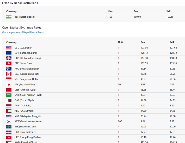 त्यस्तै, १ युरोपियन युुरो डलरको नेपाली बजारमा १२८ रुपैयाँ १२ मा खरिद भईरहेको छ भने १२८ रुपैयाँ ७२ पैसामा विक्री भईरहेको छ । युके पाउन्डलाई १४७ रुपैयाँ ४८ पैसामा खरिद र १४८ रुपैयाँ १८ पैसामा बिक्रि भईरहेको छ ।