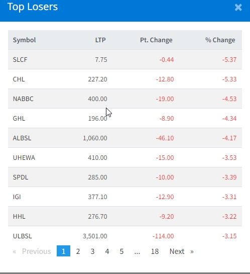 त्यस्तै, छ्यांग्दी हाइड्रोपावरको ५।३३, नारायणी डेभलपमेन्ट बैंकको ४।५३, घलेमि हाइड्रोको ४।३४ र आशा लघुवित्तको ४।१७ प्रशिशतले शेयर मूल्य घटेको छ ।