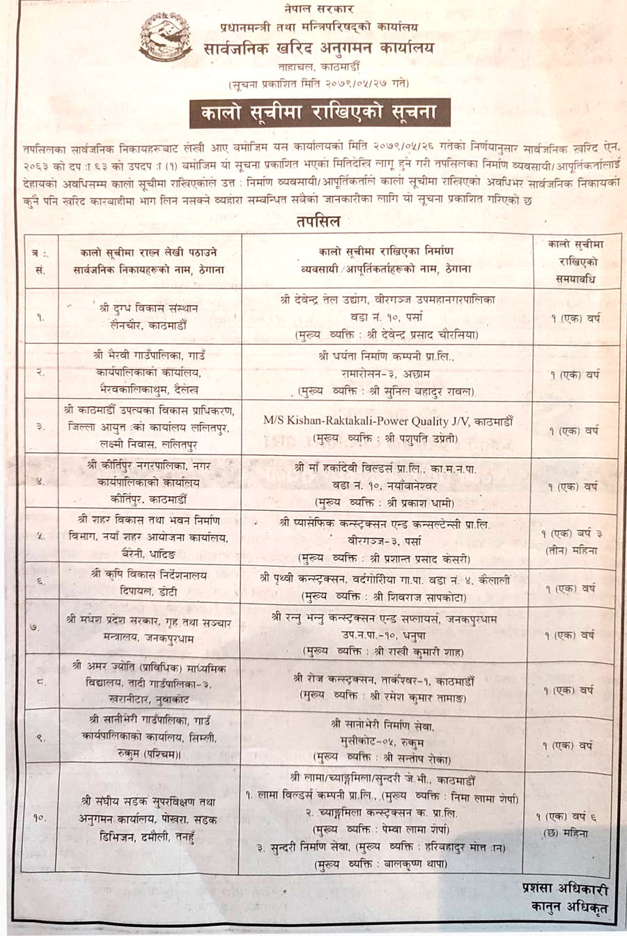 कार्यालयले सडक, सहरी विकासको भवन, दग्ध संस्थानलगायतको काम समयमा नगरेका कारण १२ निर्माण व्यवसायीलाई कालोसूचीमा राखेको हो । कार्यालयका अनुसार कालोसूचीमा पर्ने व्यवसायीले डेढ वर्षसम्म कुनै पनि सार्वजनिक खरिदमा सहभागी हुन पाउने छैनन् ।