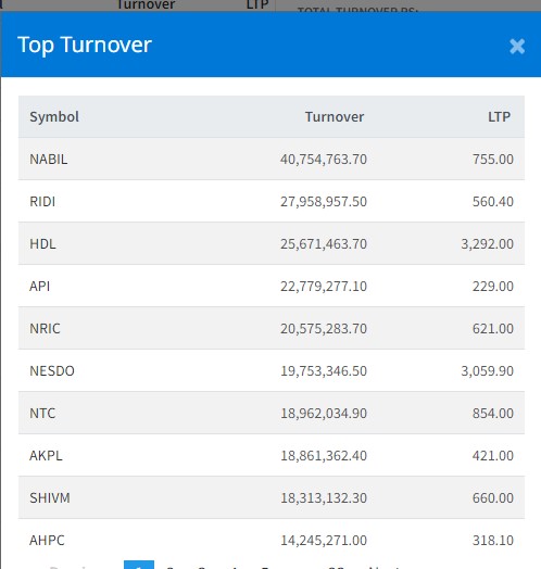 त्यस्तै, दोस्रोमा रिडी हाइड्रोपावरको २ करोड ७९ लाख, हिमालयन डिस्टिलरीको २ करोड ५६ लाख, अपि पावरको २ करोड २७ लाख र नेपाल पुनर्बीमा कम्पनीको २ करोड ५ लाख रुपैयाँमा माथिको कारोबार भएको छ ।