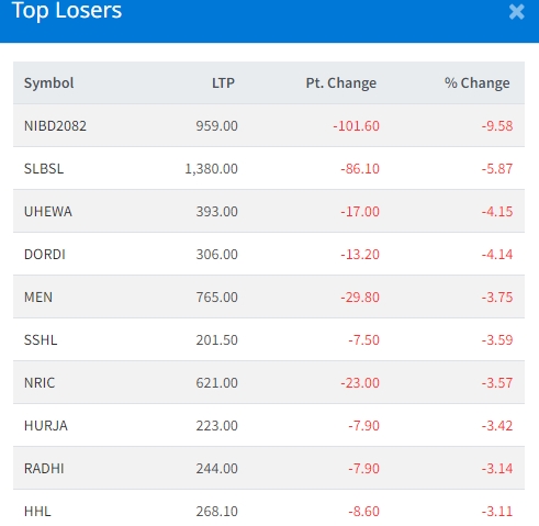 त्यस्तै, सामुदायिक लघुवित्तको ५।८७, अप्पर हेवाखोला हाइड्रोपावरको ४।१५, दोर्दीखोला जलविद्युतको ४।१४ र माउन्टेन इनर्जीको ३।७५ प्रतिशतले शेयर बजार मूल्य घटेको छ ।
