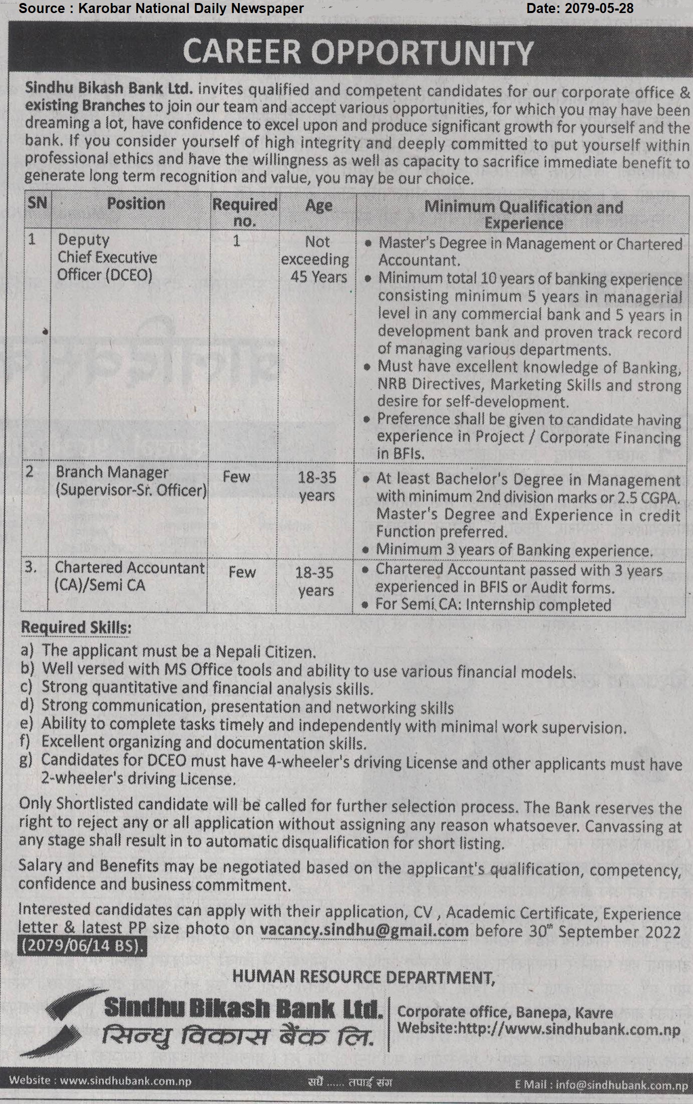 बैंकले डेपुटी चिफ एक्सक्युटिभ अफिसर पदमा १ जना, ब्रान्च म्यानेजर र चार्टेट अकाउन्टेन्टमा केहि संख्याले कर्मचारी माग गरेको छ । सो पदका लागि मान्यता प्राप्त शैक्षिक संस्थाबाटविषयमा स्नातक तह देखि स्नाकोत्तर तह उत्तीर्ण सम्म शैक्षिक योग्यता हुनुपर्ने जनाएको छ ।