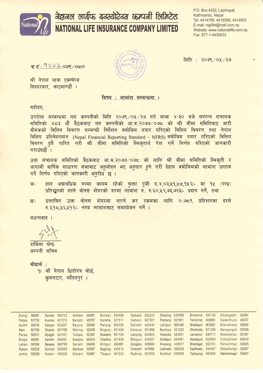 नेशनल लाइफ इन्स्योरेन्सद्धारा लाभांश घोषणा, बोनस र नगद कति ?