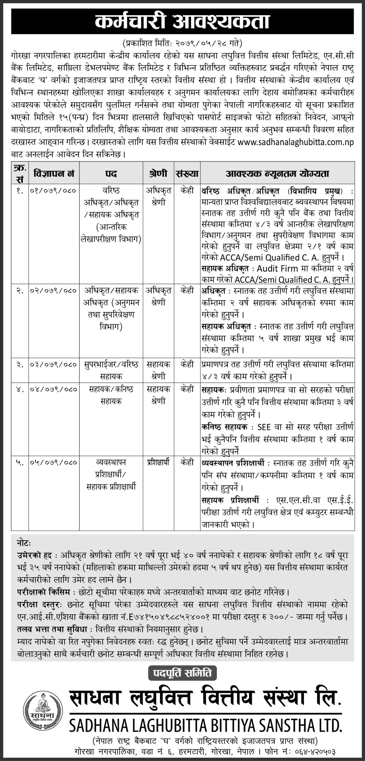 योग्यता पुगेका इच्छुक ब्यक्तिले संस्थाको वेवसाईट www.sadhanalaghubitta.com मार्फत दरखास्त दिन सक्नेछन् ।