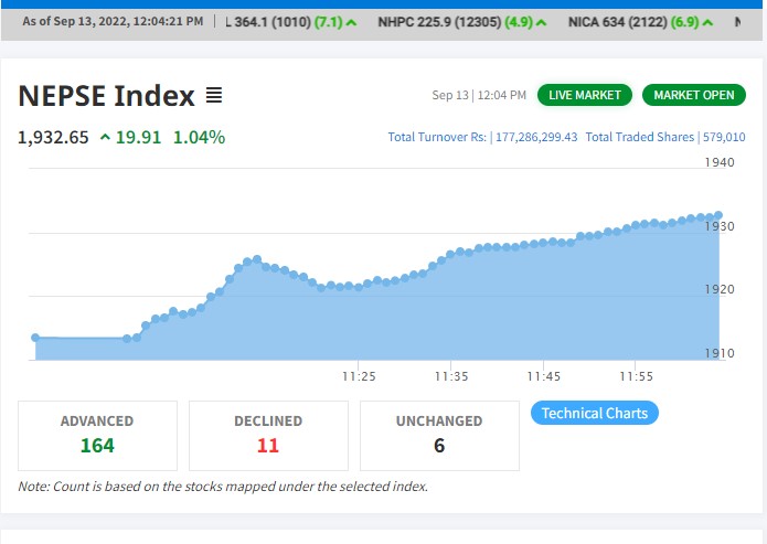 काठमाडौं । साताको दुई दिन लगातार घटेको शेयर बजार खुलेको एक घण्टामा १९।९१ अंकले बढ्दा १९३२।६५ को विन्दुमा कायम भएको छ ।यो समाचार तयार पार्दासम्म १७ करोड रुपैयाँ बराबरको शेयर कारोबार भईसकेको छ। भने नबिल बैंकको सर्वाधिक कारोबार भएको छ।