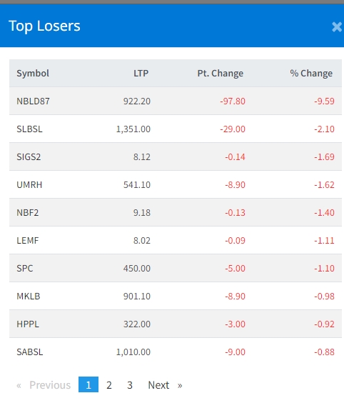 त्यस्तै, सामुदायिक लघुवित्तको २।१०, सिदार्थ इन्भेष्टमेन्ट ग्रोथको १।६९, युनाईटेड मार्दी हाइड्रोपावरको १।६२ र नबिल ब्यालेन्स्ड फण्डको १।४० प्रतिशतले शेयर मूल्य घटेको छ ।