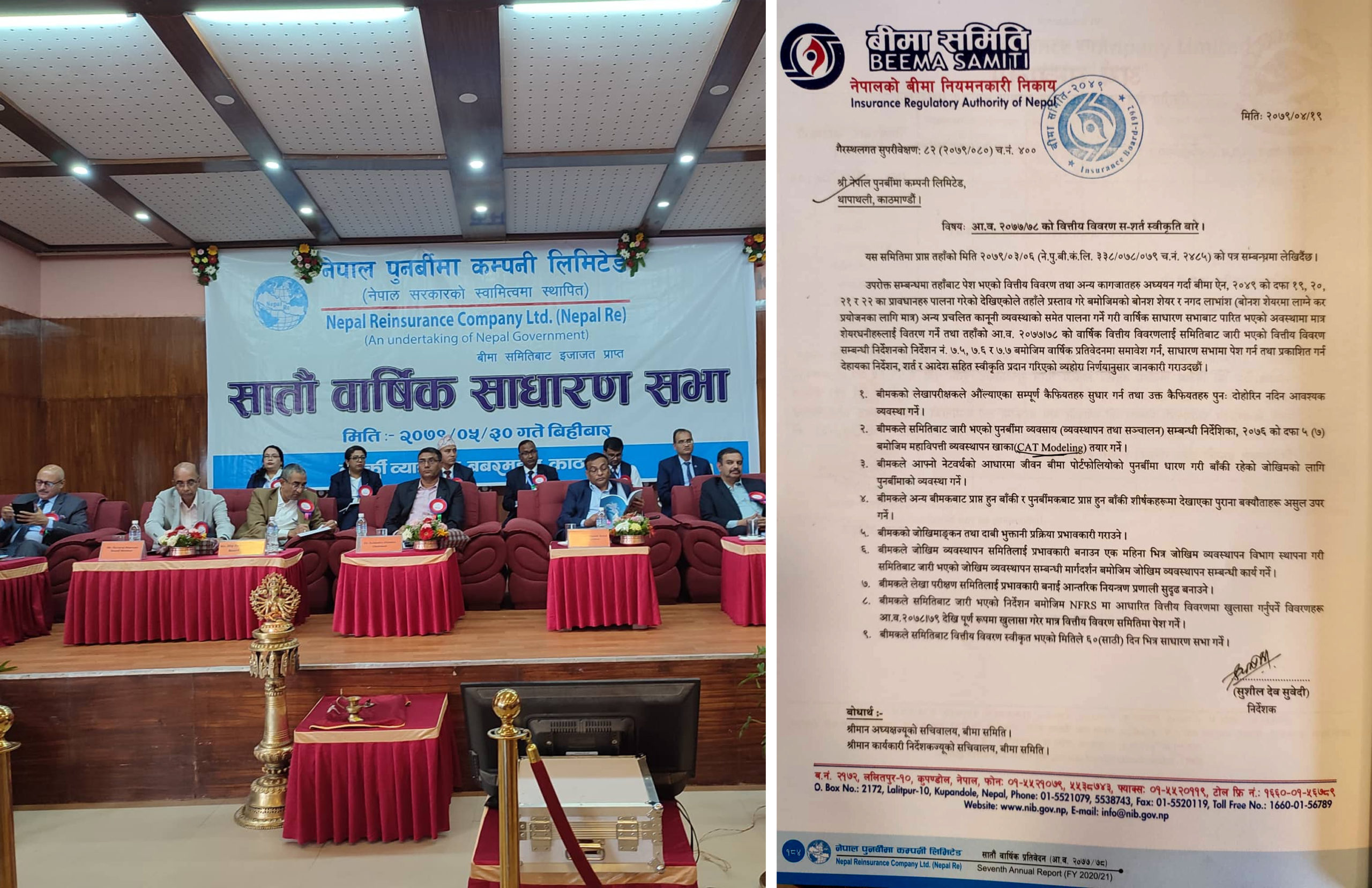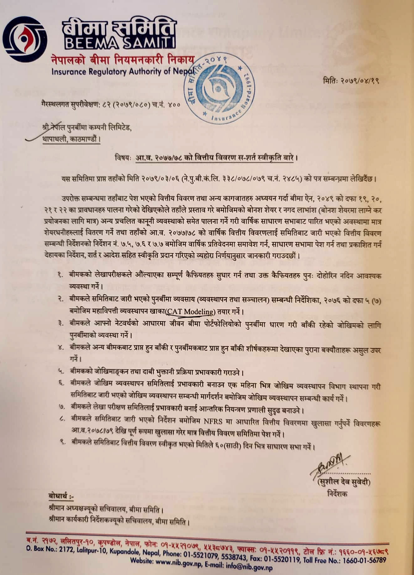 बीमा समितिले गत साउन १९ गते वित्तीय विवरण स्वीकृतसँगै प्रेषित गरेको पत्रमा नेपाल पुनर्बीमा कम्पनीलाई महाविपत्ति जोखिम व्यवस्थापन सम्बन्धी (क्याट मोडलिङ) मोडालिटी बनाउन निर्देशन दिएको छ ।