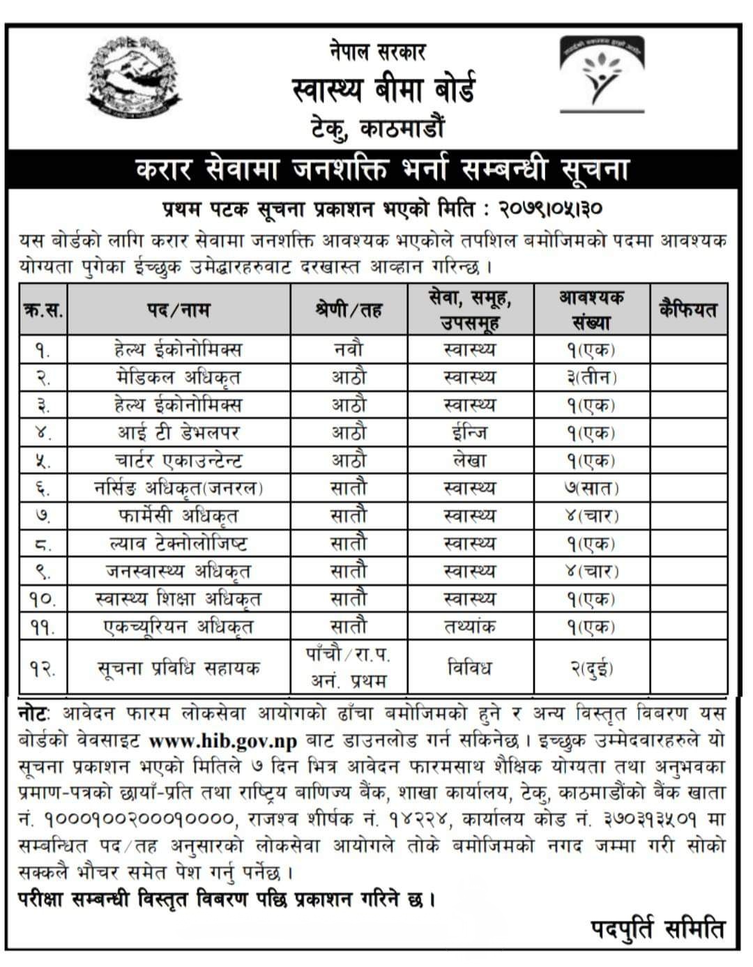 स्वास्थ्य बीमा बोर्डले करार सेवामा खुलायो रोजगारको अवसर, कहिले सम्म दिन पाइन्छ आवेदन ?