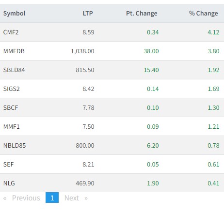 सिटिजन म्युचुअल फण्ड २, मिर्मिरे माईक्रोफाइनान्स, एसबिएल डिभेञ्चर २०८४, सिद्धार्थ इन्भेष्टमेन्ट ग्रोथ स्किम २, सनराईज ब्लुचिप फण्ड, मेगा म्युचुअल फण्ड १, नबिल डिभेञ्चर ८५, सिद्धार्थ इक्विटी फण्ड र एनएलजी इन्स्योरेन्स कम्पनीको शेयर मूल्य बढेको छ।