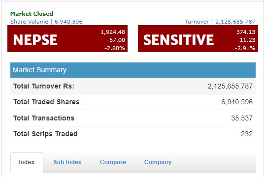 तर लगानीकर्ताको उत्साह आजको मार्केट डेप्थअनुसार टिक्न सकेन । आज नेप्से परिसूचक ५७ अंकले घटेर १९२४ विन्दुमा पुगेको छ । नेपाल बैंकर्स संघको आज बसेको कार्यसमितिको बैठकले राष्ट्र बैंकको निर्देशनमा रही बैंकहरुले आफुखुशि ब्याजदर निर्धारण गर्न पाउने निर्णय गरेसँगै शेयरबजार प्रभावित बन्न पुगेको हो ।