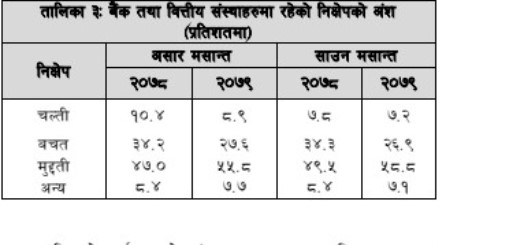 आर्थिक बर्ष २०७९ साउनमा बैंक तथा वित्तीय संस्थाहरूको कुल निक्षेपमा चल्ती, बचत र मुद्दती निक्षेपको अंश क्रमशः ७.२ प्रतिशत, २६.९ प्रतिशत र ५८.८ प्रतिशत रहेको छ ।अघिल्लो वर्ष यस्तो अंश क्रमशः ७.८ प्रतिशत, ३४.३ प्रतिशत र ४९.५ प्रतिशत रहेको थियो ।